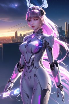 (A girl from the future jumps out of the phone screen), with a close-up of the girl jumping out of the screen as the visual center, holographic projection phone, surreal style, sense of technology, fantasy engine, immersive, extremely detailed details, highly detailed, research environment, 8K resolution, realistic lighting description,xwhd,Cyberworld,alone,mecha musume,mechanical parts, robot joints,single mechanical arm, headgear, mechanical halo,star halo,intricate mechanical bodysuit, mecha corset, full armor, very long hair,white hair, hair between eyes, multicolored hair, colored inner hair, glowing eye,eye trail, random expressions,random action, pond, starry sky,skyline,Pink Mecha,Cyberworld,emauromin style