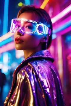 1girl, best quality, cyber poakl on eyes, This is a futuristic sci-fi photo. The woman in the photo is dressed in a stylish cyberpunk style, standing in a cityscape filled with a sense of technology. The photo adopts the shooting style of David LaChapelle, with bright colors and strong contrast. The woman's posture is confident and mysterious, the light shines on her face, making her features more unique. The depth of field treatment blurs the background, making people focus more on the theme.