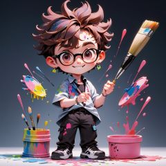MG_ip,Pixar,1boy, solo, male focus, glasses, holding, chibi, paint, earrings, smile, jewelry, brown hair, paint splatter on face, pants, pink hair, paintbrush, looking at viewer, paint splatter, black eyes, short hair, holding paintbrush, standing, undercut, full body, palette \(object\), closed mouth, gradient background, black-framed eyewear, shirt, black footwear, gradient, round eyewear, painting