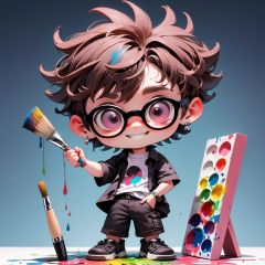 MG_ip,Pixar,1boy, solo, male focus, glasses, holding, chibi, paint, earrings, smile, jewelry, brown hair, paint splatter on face, pants, pink hair, paintbrush, looking at viewer, paint splatter, black eyes, short hair, holding paintbrush, standing, undercut, full body, palette \(object\), closed mouth, gradient background, black-framed eyewear, shirt, black footwear, gradient, round eyewear, painting
