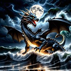 dragon,zhongguolong,reflection,solo,outdoors,from side,scales,ocean,full body,night,moon,Black Cloud,Lightning,rainstorm,wild winds and huge waves,High resolution, master like work, (masterpiece: 1.2), best quality, ultra detailed, realistic rendering,