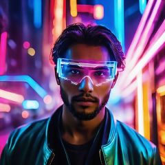 Behind him is a cityscape filled with neon lights and electronic billboards. Skyscrapers, drones, hovering cars, and various tech devices compose a futuristic picture. However, this world is also filled with chaos and uncertainty, a feeling that is highlighted in his eyes.