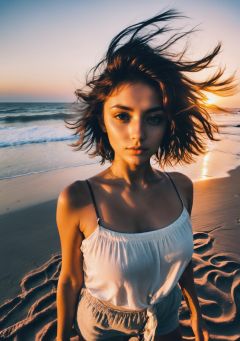 xxmix_girl,a woman takes a fisheye selfie on a beach at sunset, the wind blowing through her messy hair. The sea stretches out behind her, creating a stunning aesthetic and atmosphere with a rating of 1.2.