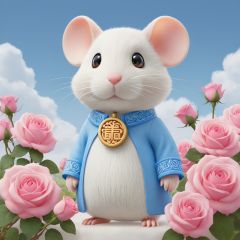 masterpiece, Little Mouse, Lovely, In the middle of the picture, Mid-range, Outdoor, Light blue sky, Clouds, Garden, Big tree, Pink roses, Collar, Furry, Twelve signs of the Chinese zodiac, textured skin, super detail, best quality <lora:Cutepetparty-000006:0.5>
