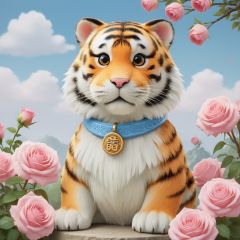 masterpiece, Little tiger, Lovely, In the middle of the picture, Mid-range, Outdoor, Light blue sky, Clouds, Garden, Big tree, Pink roses, Collar, Furry, Twelve signs of the Chinese zodiac, textured skin, super detail, best quality <lora:Cutepetparty-000006:0.5>