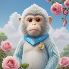 masterpiece, Little monkey, Lovely, In the middle of the picture, Mid-range, Outdoor, Light blue sky, Clouds, Garden, Big tree, Pink roses, Collar, Furry, Twelve signs of the Chinese zodiac, textured skin, super detail, best quality <lora:Cutepetparty-000006:0.5>