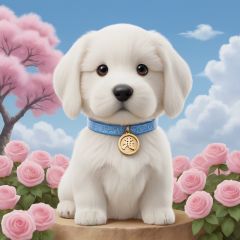 masterpiece, Puppy, Lovely, In the middle of the picture, Mid-range, Outdoor, Light blue sky, Clouds, Garden, Big tree, Pink roses, Collar, Furry, Twelve signs of the Chinese zodiac, Corky Dog, textured skin, super detail, best quality <lora:Cutepetparty-000006:0.5>