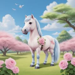masterpiece, Pony, Lovely, In the middle of the picture, Mid-range, Outdoor, Light blue sky, Clouds, Garden, Big tree, Pink roses, Collar, Furry, Twelve signs of the Chinese zodiac, textured skin, super detail, best quality <lora:Cutepetparty-000006:0.5>