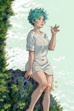 1girl, cat girl, light green hair, messy hair, long hair, (Detailed eyes description), :3, yellow eyes, cute, oversized clothes, (oversized white shirt), (bare legs), beach, seaside, water drops, shine, sunlight, rocks, (masterpiece:1.2), (best quality), (ultra-detailed), ,