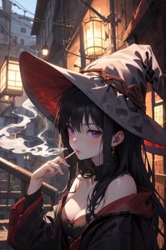 masterpiece, best quality, PIXIV,smoking girl,elaina \(majo no tabitabi\), witch, witch hat,purple eyes,  upper body,  <lora:smoking girl_20230912150007:0.6>