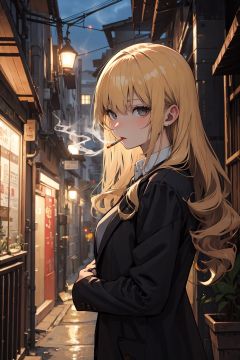 masterpiece, best quality, PIXIV,smoking girl,1girl,blonde hair, very long hair, Curly hair,mature female, business suit, black open coat, Alley, nightupper body,  <lora:smoking girl_20230912150007:0.6>