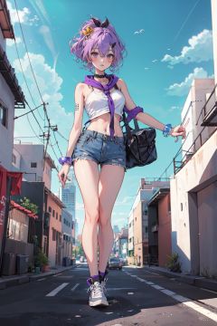 (masterpiece:1.2), best quality,PIXIV, cool girl,javelin \(azur lane\), purple hair, full body, street,short shorts, <lora:cool girl_20230913102000:0.7:1,1,1,1,1,1,1,1,1,1,1,1,1,1,1,0,0>   <lora:javelin_v3.0:0.8:CHARACTER>