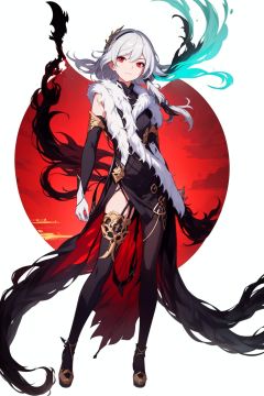 (masterpiece:1.3), (the best quality:1.2), (super fine illustrations:1.2), (Masterpiece), high quality, high detail,(white background:1.2), looking at viewer, (SOLO:1.4),outline,,simple background,  fuhua/heiyu, fu_hua, feathers, multicolored_hair, black_feathers, white_hair, silver_hair, red_eyes, hair_ornament
