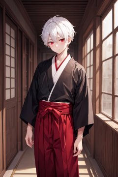 1boy, white hair, red eyes, masterpiece, best quality, formal hakama, katana, facing viewer, looking at viewer