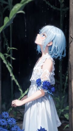 rain,dark,(((Cornflower))), cornflower, cornflower,vines, forest, ruins, Blurred picture, lens flare, hdr, Tyndall effect,damp,wet, 1girl, bare shoulders,cold theme, broken glass, broken wall, aqua theme, white hair, blinking, white dress, closed mouth, constel lation, flat color, braid, blinking, white robe, float, closed mouth, constel lation, flat color, looking up, standing, medium hair, standing, solo