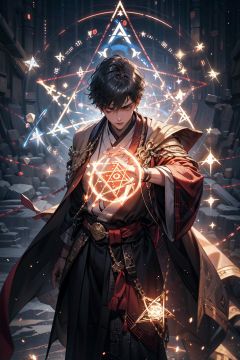 A young man dressed in ancient mage clothing, flame robe, handsome, gestures forming spells, martial arts and fairy-like vibe, carrying a hexagram magic array on his back, game character, surrounded by runes, magic patterns surrounding, best quality, masterpiece, cg, hdr, high definition, extremely detailed, detailed face, superhero, hero, detailed UHD, vfx, 3D rendering,