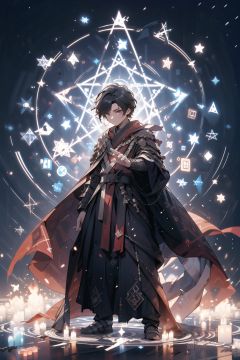 A young man dressed in ancient mage clothing, flame robe, handsome, gestures forming spells, martial arts and fairy-like vibe, carrying a hexagram magic array on his back, game character, surrounded by runes, magic patterns surrounding, best quality, masterpiece, cg, hdr, high definition, extremely detailed, detailed face, superhero, hero, detailed UHD, vfx, 3D rendering,