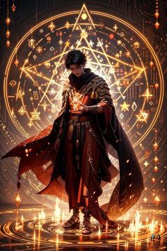 A young man dressed in ancient mage clothing, flame robe, handsome, gestures forming spells, martial arts and fairy-like vibe, carrying a hexagram magic array on his back, game character, surrounded by runes, magic patterns surrounding, best quality, masterpiece, cg, hdr, high definition, extremely detailed, detailed face, superhero, hero, detailed UHD, vfx, 3D rendering,