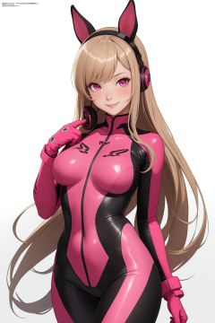 (Green Theme)The artwork is rated 5.0 for its quality and the illustration has a very detailed and complex design that resembles the cover style of a Chinese magazine (rated 1.5). The photograph is taken in real life and showcases fine details.In the picture, there is a girl wearing animal ears, bangs, blush, a tight-fitting bodysuit, gloves, earphones, and an impossible outfit. She also has horse ears and artificial animal ears, as well as a jacket, long hair, and sleeves. While smiling and looking at the audience with pink eyes, she is playing a solo piece. The bodysuit is pink and the background is simple with white gloves, long hair, and tight skin.The upper half of her body is featured in the picture, which is taken against a white background. The artwork is created by Nikke and is rated 5.0 for its high quality.