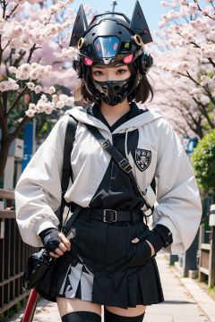 Masked knight build, mecha, samurai, samurai helmet, katana, slashing, power armor, exoskeleton, punk style, poster. Aspect ratio, battle flag, young girl, pink, JK-style skirt, black knee-high socks, cherry blossoms. The design has a modern punk vibe, featuring an exoskeleton, a headband, gloves, and a school uniform.,miji