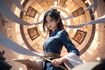 (Low angle shooting, ultra wide angle shooting), a girl in uniform stands in the air, in a suit set, surrounded by golden runes, black hair, long hair, messy hair, (facial focus), exquisite eyebrows, beautiful facial features, (upper body close-up photo: 1.2), sparkling runes, blue Hanfu, (surrounded by rotating long scroll: 1.2), (floating transparent Chinese characters), dynamic movements, Best picture quality, 3D rendering, up view, ultra wide angle, fisheye, lens focus, ultra realistic and detailed, high detail texture, ultra high quality, 16k