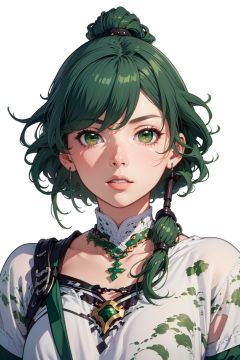 (masterpiece:1.3), (the best quality:1.2), (super fine illustrations:1.2), (Masterpiece), high quality, high detail,((white background:1.2)), looking at viewer, (SOLO:1.4),outline,,simple background,  h404, fu hua, green_eyes, green_hair, hair_between_eyes