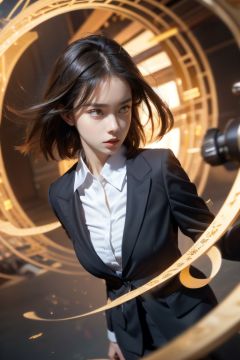 (low angle, super wide angle) , a girl in a uniform standing in the air, wearing a suit, suit, surrounded by golden runes, black hair, short hair, messy hair, (facial focus) , delicate eyebrows, beautiful features, (upper body close-up photo: 1.2) , sparkling runes, (rotating scroll: 1.2) , (floating transparent characters) , dynamic motion, Best Picture Quality, 3D rendering, top view, ultra wide angle, fish eye, lens focus, ultra-realistic and detailed, high-detail textures, ultra-high quality, 16k, channel runes, flow reels