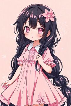 1girl, flower, hair flower, solo, hair ornament, very long hair, dress, long hair, pink flower, braid, pink dress, blush, eyebrows visible through hair, parted lips, twin braids, bangs