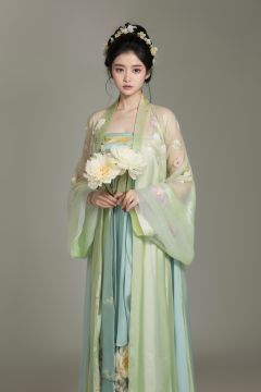 qingyi,danya,1girl,black hair,hanfu,flower,realistic,hair ornament,chinese clothes,simple background,dress,white background,black eyes,long sleeves,holding,holding flower,<lora:春赏-000008:0.5>,hanfu,cho girl,