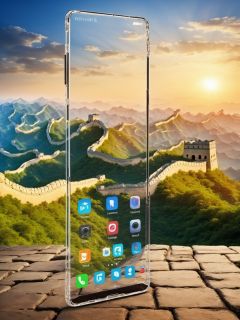 high quality,Transparent smartphones uspended in the space,no humans,The background is the great wall,