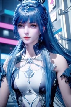 (Masterpiece, Best Picture Quality, Special Effects), Cyberpunk., projecting a girl, blue hair, bangs, futuristic style (module),,1 girl,xwhd