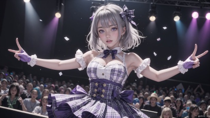 (masterpiece), best quality, high resolution, highly detailed, detailed background, cinematic lighting, looking_at_viewer, 1girl, silver hair, medium hair, medium breasts, purple eyes, idol, purple white idol clothes, underbust, stage, glowstick, stage lights, music, blush, heavy_breathing, sweat, concert, white frilled gloves, frilled microskirt, frill, confetti, heart, hair ornament, hair bow, gemstone, jewelry, neon lights, plaid bow, plaid shirt, pointing, spotlight, sparkle, light particles, framed breasts, cross-laced,