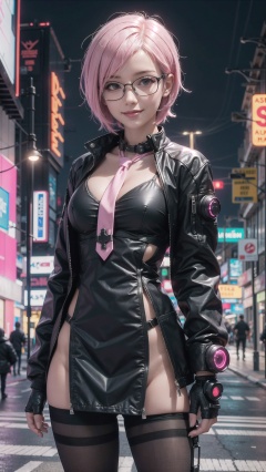 (masterpiece), best quality, high resolution, highly detailed, detailed background, perfect lighting, 1girl, pink hair, short hair, slender, medium breasts, smile, blush,  glasses, jacket, short dress, necktie, between_breasts, pantyhose, (cyberpunk:1.4), street, night, city, outdoor, sci-fi, futuristic clothes,