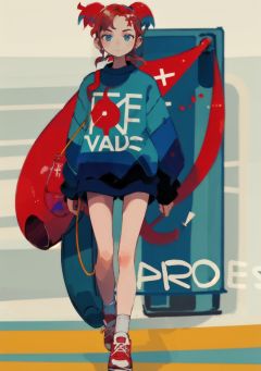1girl, <lora:clearstyle:0.8>,clearstyle,blue background, walking, red hair, shop, simple background,