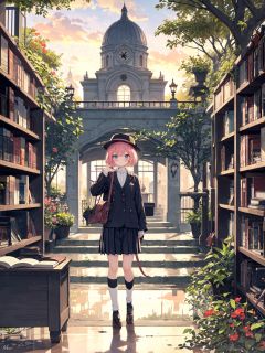 architecture,bag,blush,book stack,bridge,depth of field,full body,grand piano,hat,holding,holding umbrella,horizon,indoors,jacket,library,nature,no humans,outdoors,pleated skirt,pointing,scenery,short hair,signature,sky,socks,solo,standing,sunset,tree,