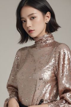 Lanvin sequin-embellished blouse with a high neck and balloon sleeves,Canon EOS 5D Mark IV with Canon EF 24-70mm f/2.8L II,design by ****·麦昆(Alexander McQueen) girl,1girl,solo,black eyes,