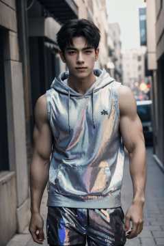 absurdres, intricate details, masterpiece, best quality, high resolution, 8k, 1boy, Manhuanan, sleeveless hoodie, shorts, (holographic clothing),looking at viewer, standing, smirk, (muscular, large pectorals), abs, hair between eyes, detailed face, black eyes, black hair, eye reflection, blue necklace,street,detailed background, cinematic lighting<lora:NIJI动漫男风格_v1.0:0.5> <lora:chinesemalelikeness3:0.4> <lora:镭射服装_holov7:0.8>