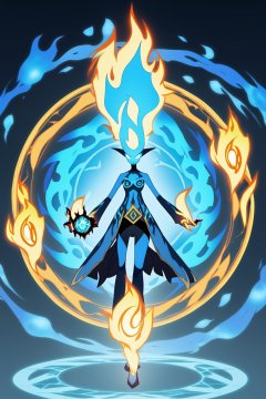 elemental,1 gir, Fire effect, water effect, Infinite wisdom, blue flame, Warlock, Magical Circle, high detailed, anime, 2d, masterpiece,
