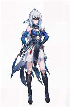 8k, best quality, masterpiece, (ultra-detailed:1.1), (high detailed skin), (full body:1.2), white background, standing, hand on hip, <lora:jingliu-v100-000018:0.8>, jingliu, silver hair, elbow gloves, long hair, (blindfold:1.2), boots, bare shoulders, dress, hair ribbon, <lora:EnvyBetterHands LoCon_beta2 辅助:0.65>, (good hands,nice hands:0.6), (white background, simple background,:1.2), (beautiful_face), ((intricate_detail)), clear face, ((finely_detailed)), fine_fabric_emphasis, ((glossy)), full_shot,
