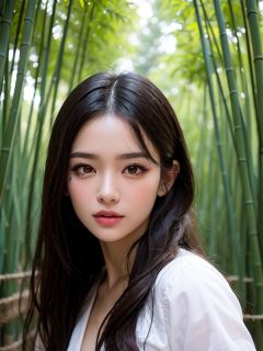 The highest masterpiece, exquisite picture quality, a girl, handsome, exquisite features, detailed facial characterization, 8K picture quality, perfect lighting, melon seed face, long eyelashes, dark green gradient hair, middle part bangs, messy hair, long curly hair, emerald pupils (eyes), delicate smooth skin, light blush, half body, posing, bamboo forest, bamboo leaves, Crane in the sky, There are pavilions and pavilions in the dense bamboo forest