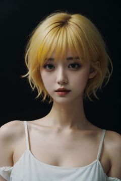 1girl,fluffy short hair,dark theme,yellow hair,messy hair,film grain,fog,black theme,