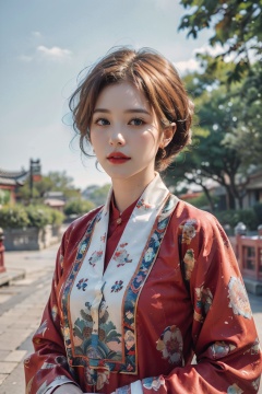 ((floral print)),((red magnificent print long sleeves)),((red print see-through dress)),1 girl,full body,(short hair),(realistic:1.7),((best quality)),absurdres,(ultra high res),(photorealistic:1.6),photorealistic,octane render,(hyperrealistic:1.2), (photorealistic face:1.2), (8k), (4k), (Masterpiece),(realistic skin texture), (illustration, cinematic lighting,wallpaper),( beautiful eyes:1.2),((((perfect face)))),(cute),(standing),((blonde hair)),(blue eyes),red lips, outdoors,(chinese style countryard),<lora:nhatbinhv2:0.5>