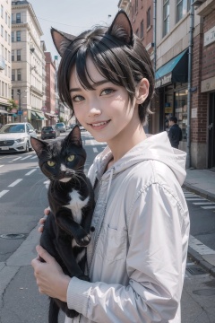 (masterpiece), street, city, 1boy, cat ears, smile