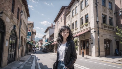 (masterpiece), scenery, architecture, building, 1girl, black hair, medium hair, wavy hair