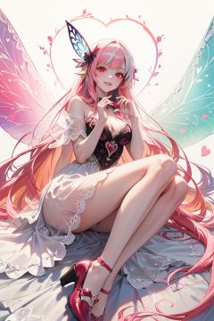 (masterpiece), (realistic), (best quality), (ultra-detailed),  amazing, ((fairy of love, red eyes, lace wings, intricate fairy-tale outfit , shoes with hearts, very long white hair with pink strands, multicolored hair, dreamy smile)))), cinematic light, unusual angle and pose,)),1 girl