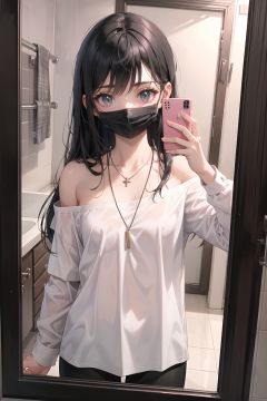 1 very long black hair (flat chest:1.1) girl wearing (black hallow out shirt:1.3) in bathroom (selfie:1.2), mouth mask, necklace, off-shoulder, masterpiece, (beautiful detailed face:1.3), (beautiful detailed background:1.3),
