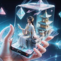 1girl, best quality, eastern mythology, Holographic projection mobile phone from poakl, best quality, cyber world, science fiction world,eastern mythology,candy-coated