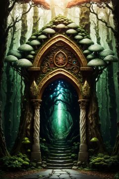 ((masterpiece)),((best quality)),8k,high detailed,ultra-detailed,fantasy,enchanted forest,(discovering a hidden portal to a mystical realm deep within an ancient forest),ancient trees,glowing mushrooms,magical portal,a journey into a world of enchantment and wonder..,<lora:UnrealNut:0.8>,