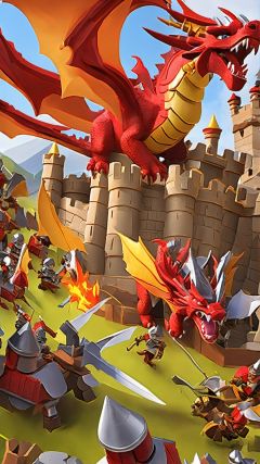 (Battle Q Style :1.5) Dragon Siege: A Q-dragon is attacking a castle, and the warriors on the castle are bravely resisting