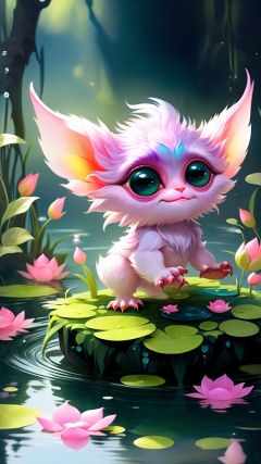 (Fantasy Q Edition Style :1.5) (Cute, simplified, cute) (Bright colors) Goblin Pond, close-up super round furry oversized eyes tart-shaped beast, playing on the edge of a clear pond with delicate petals floating on the water